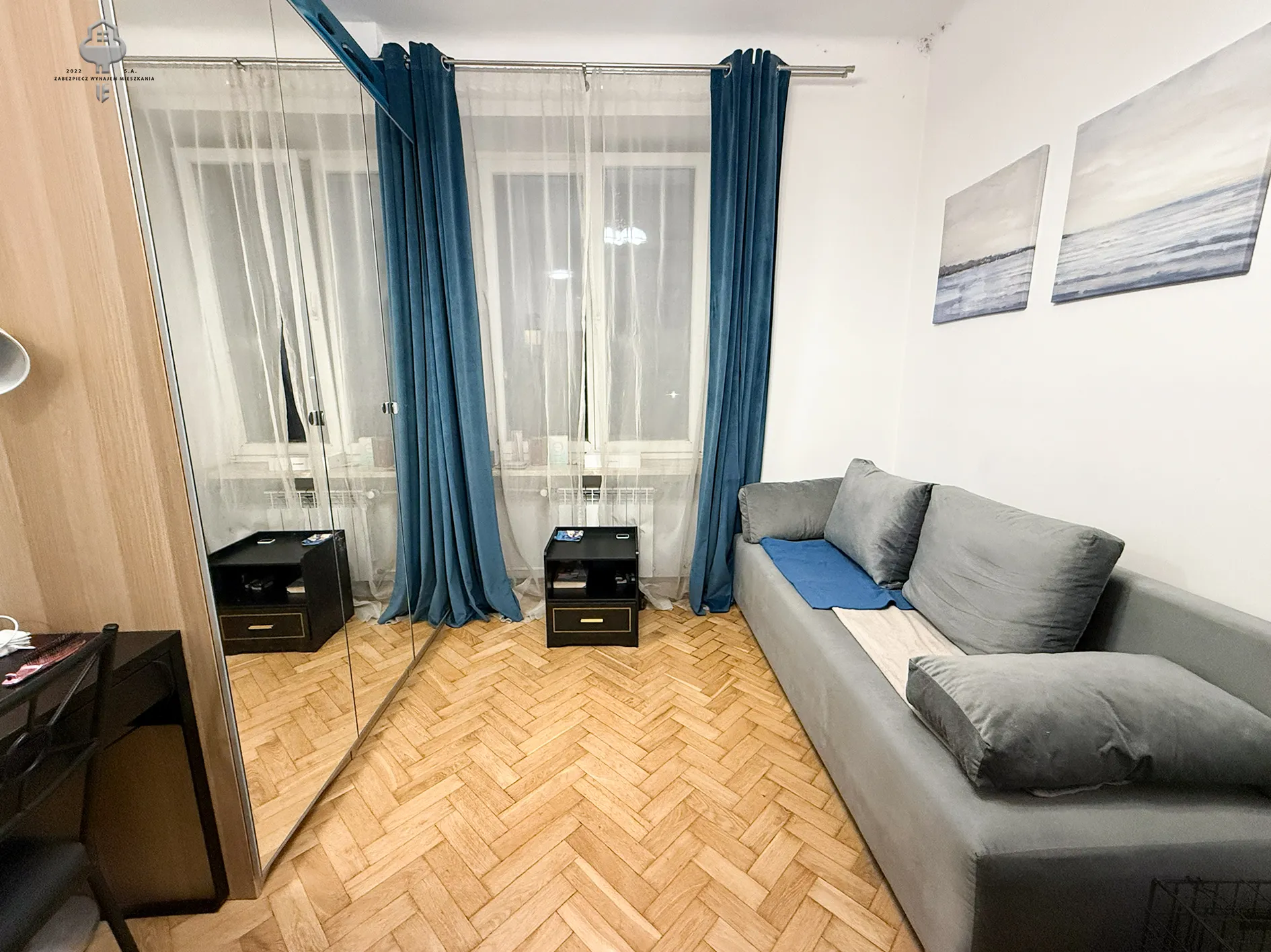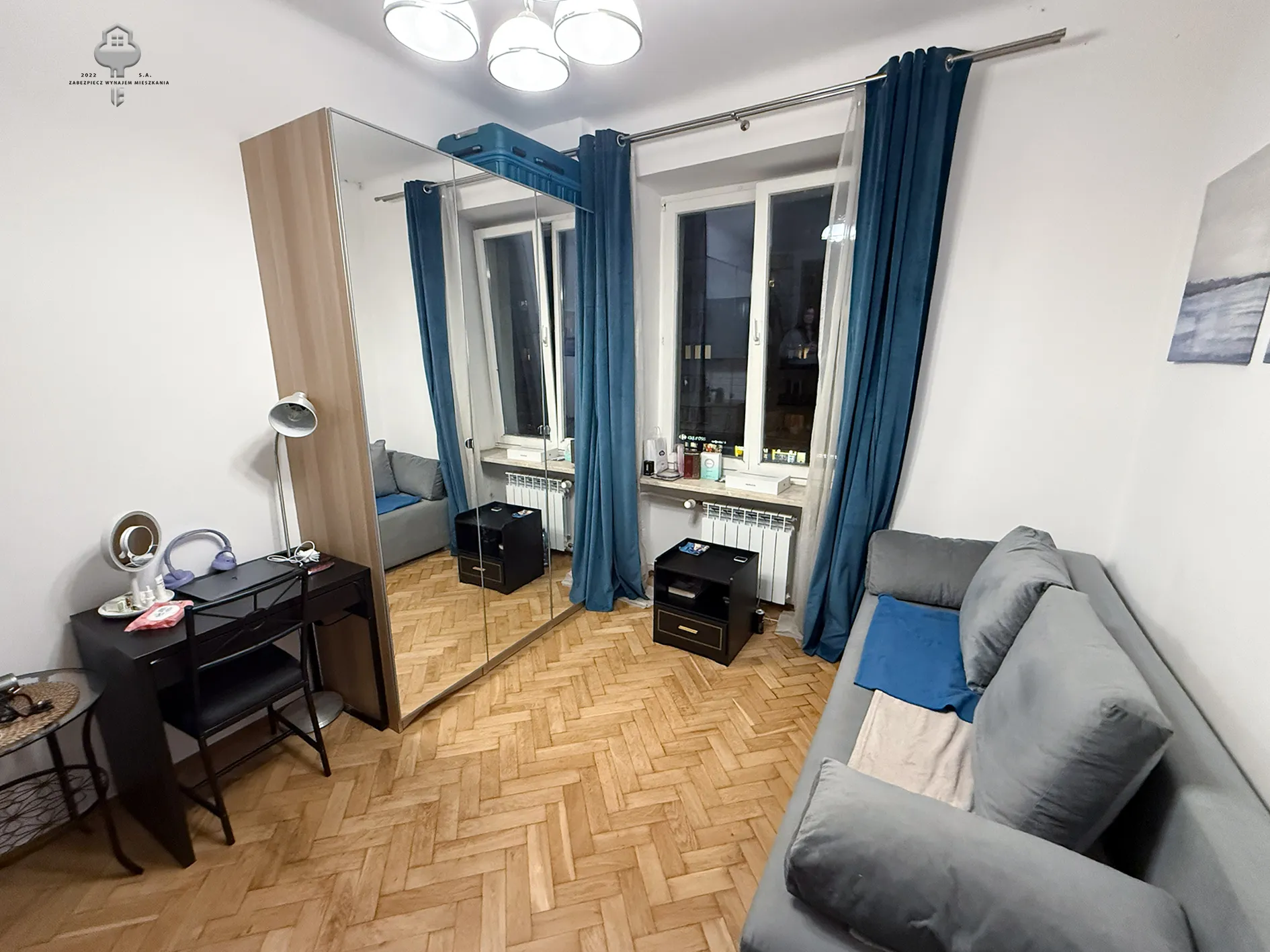 1) Salon: sofa z funkcją spania, duża szafa, szafka nocna, biurko, krzesło, lampka, stolik kawowy;