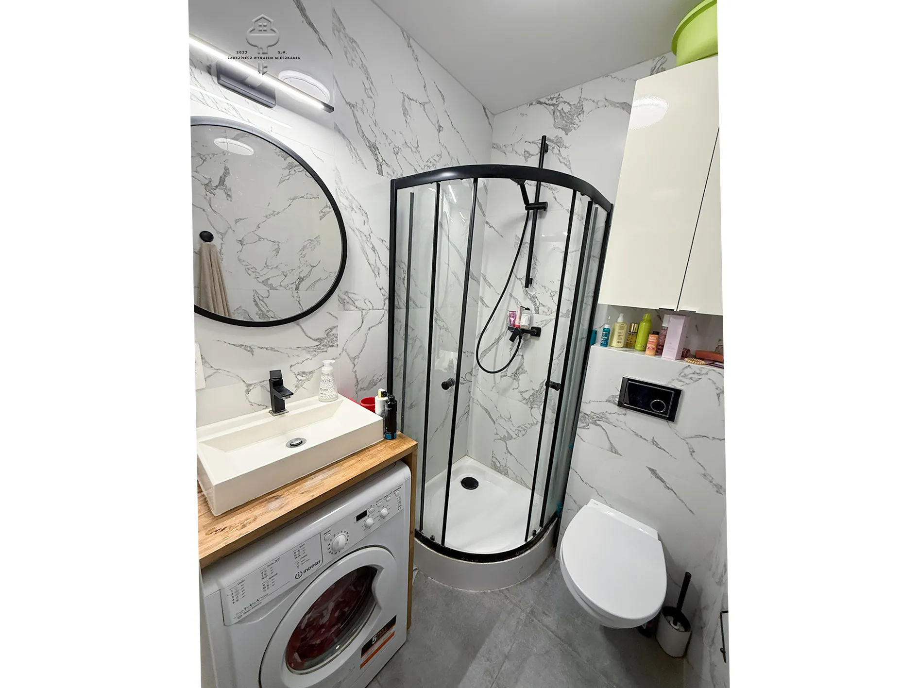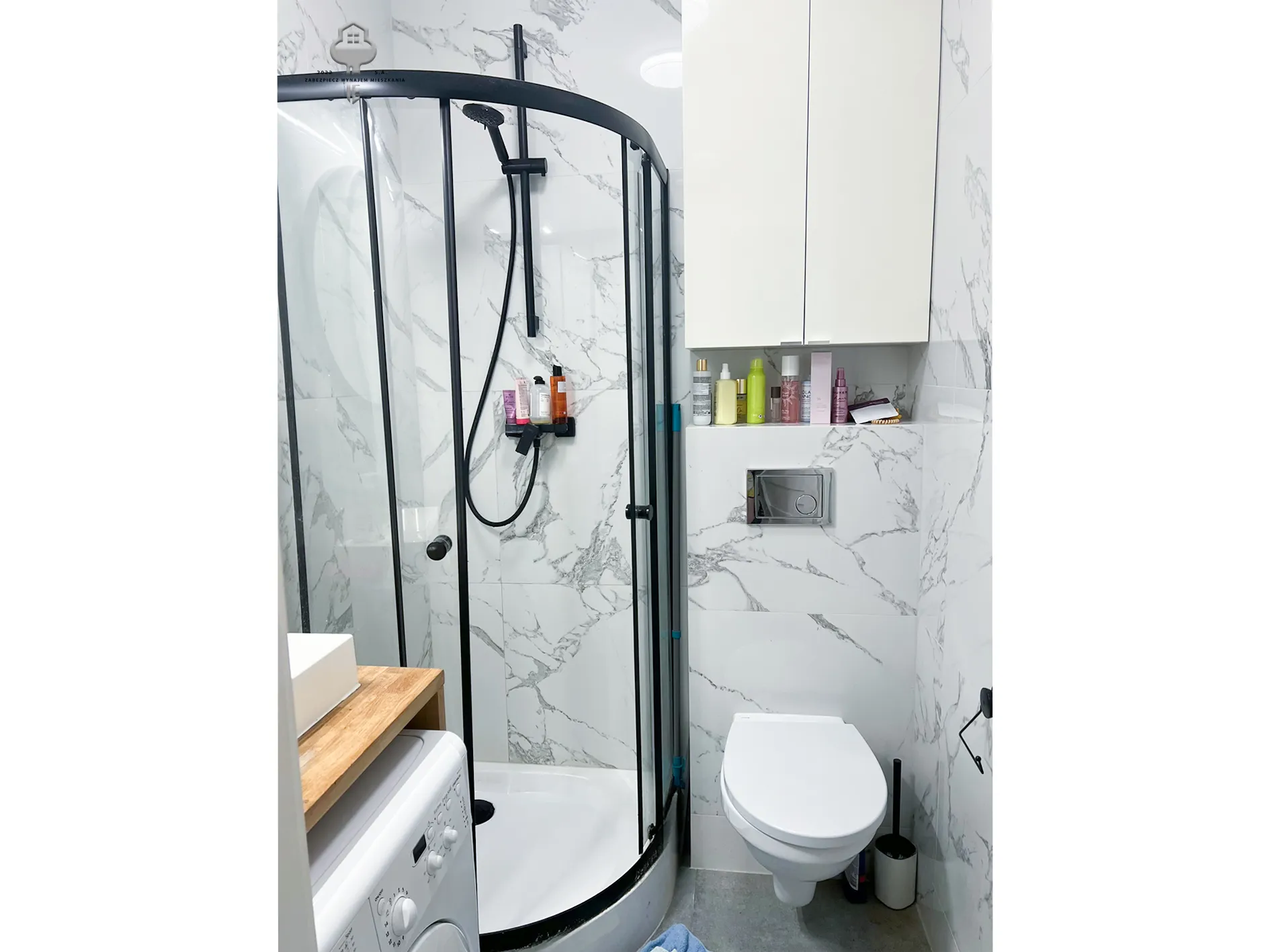 3) Łazienka: prysznic, umywalka, pralka, Geberit w zabudowie, wisząca szafka;