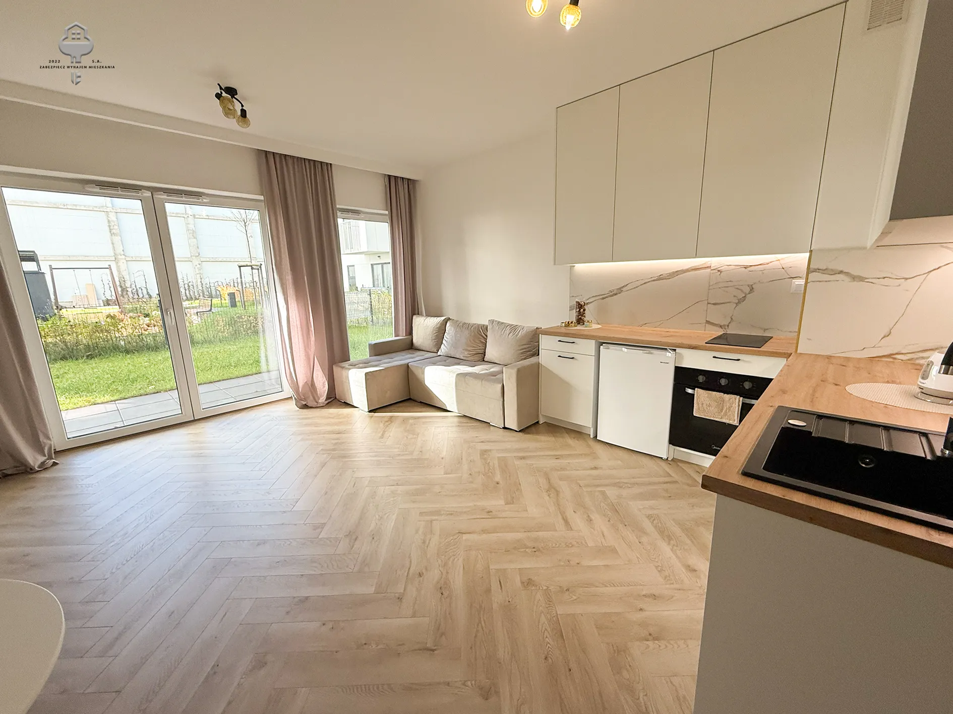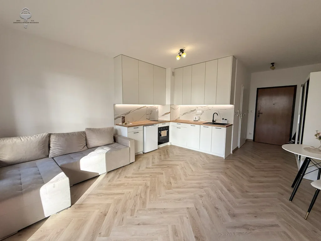 Nieruchomość zlokalizowana na spokojnym zamkniętym osiedlu. Mieszkanie urządzone w wysokim standardzie, nie zamieszkałe przez nikogo. Dominują odcienie beżu, bielu oraz dodatki drewna. Lokal składa się z aneksu kuchennego z salonem, który ma dostęp do tarasu z ogródkiem oraz przedpokoju i łazienki. W oknach zamontowane zasłony.