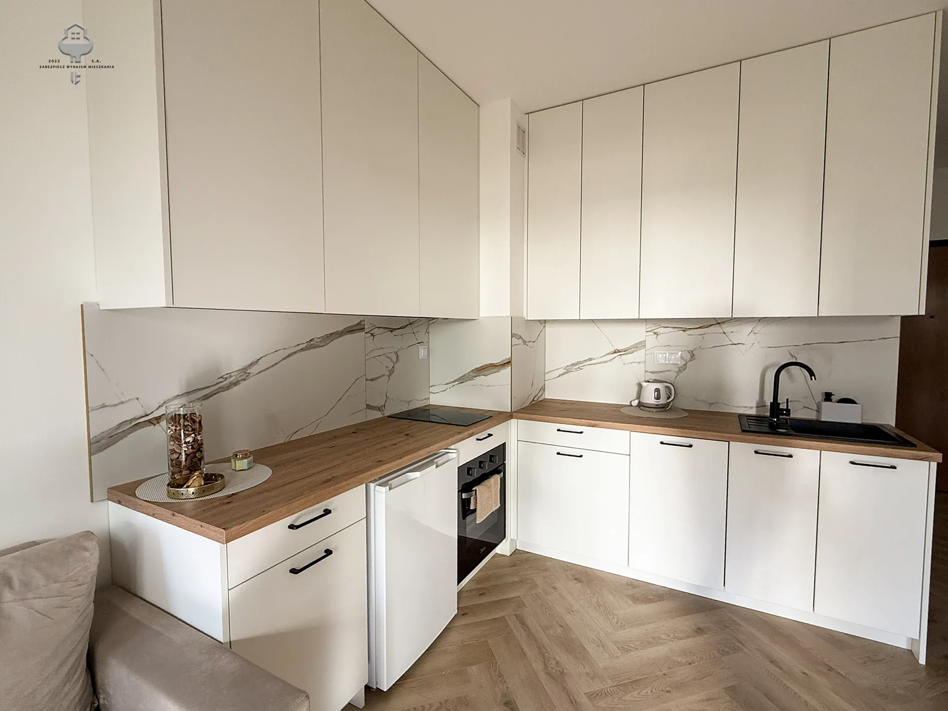 2) Kuchnia: zabudowa meblowa kuchenna, lodówka, piekarnik, płyta indukcyjna, okap, zastawa stołowa, sztućce, czajnik elektryczny;