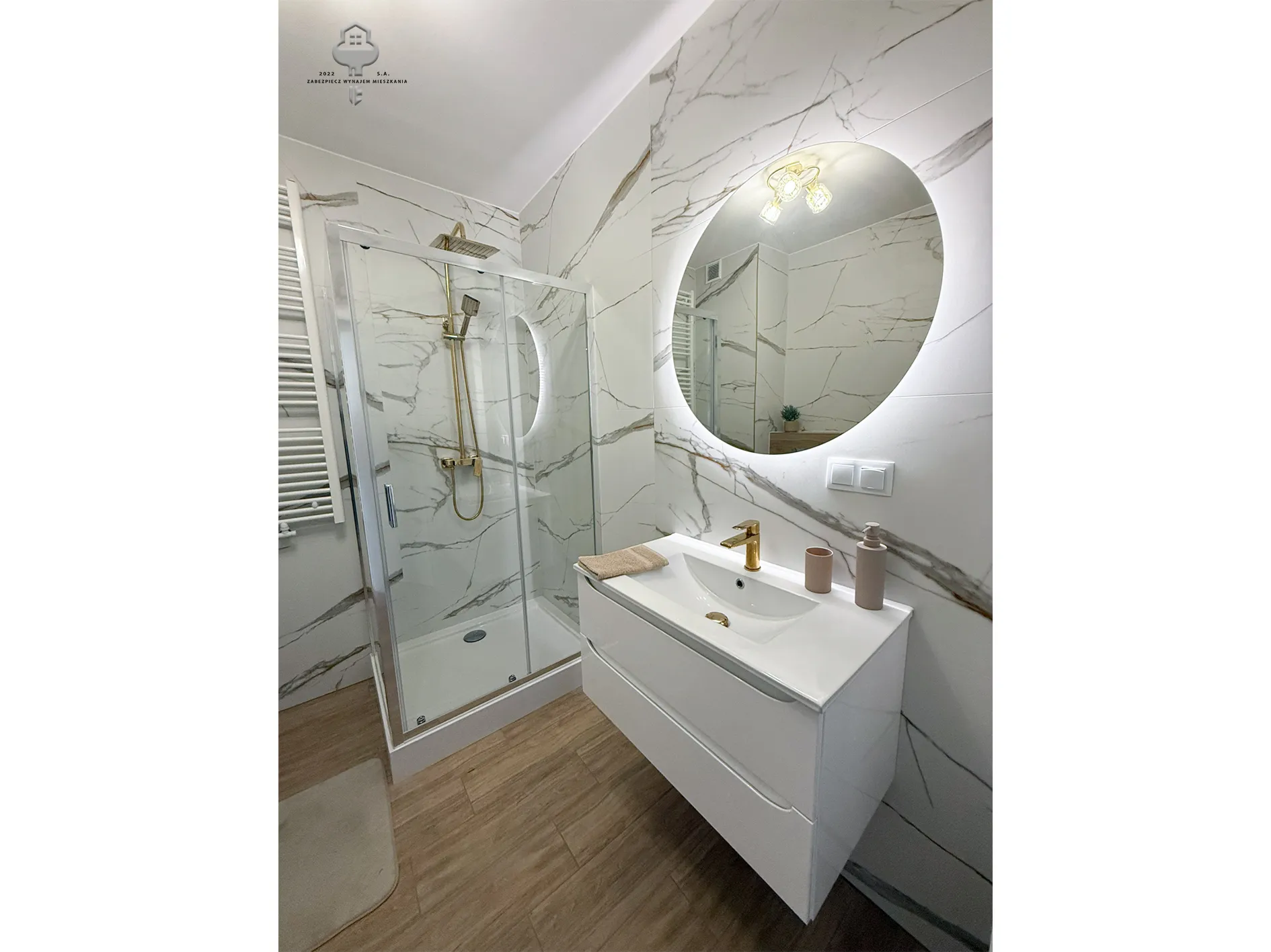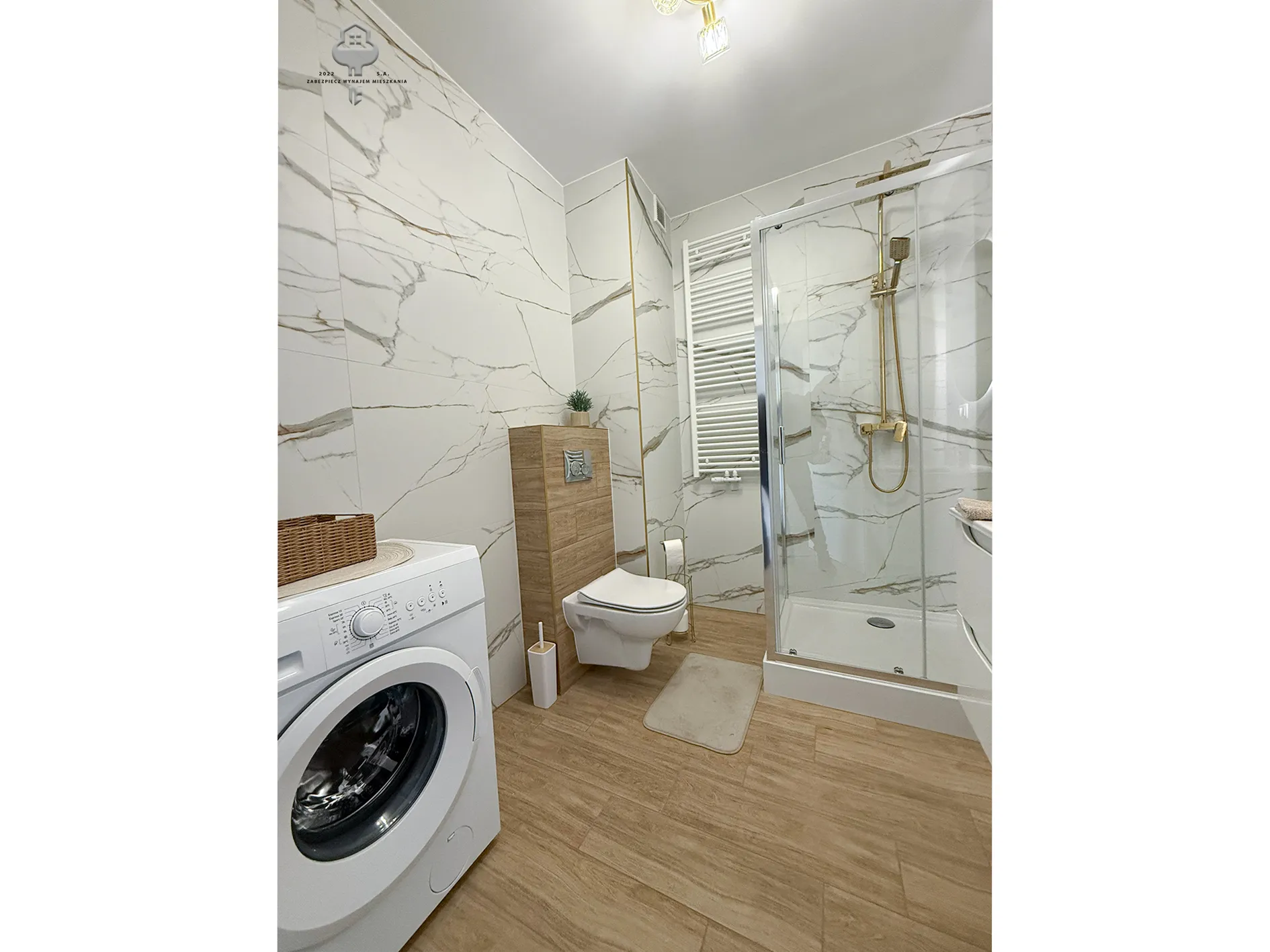 3) Łazienka: prysznic, Geberit w zabudowie, szafka wisząca z umywalką, lustro, pralka;