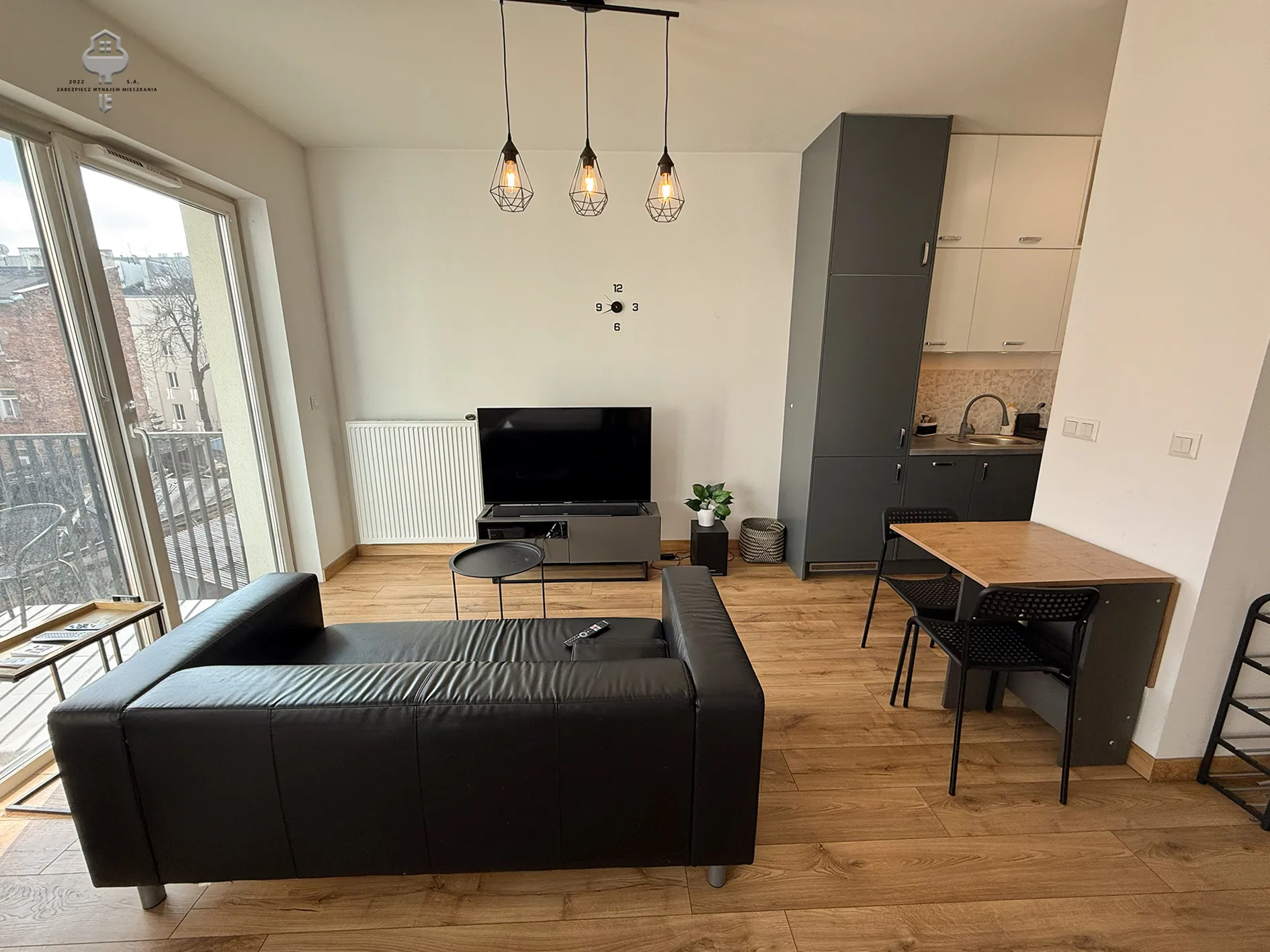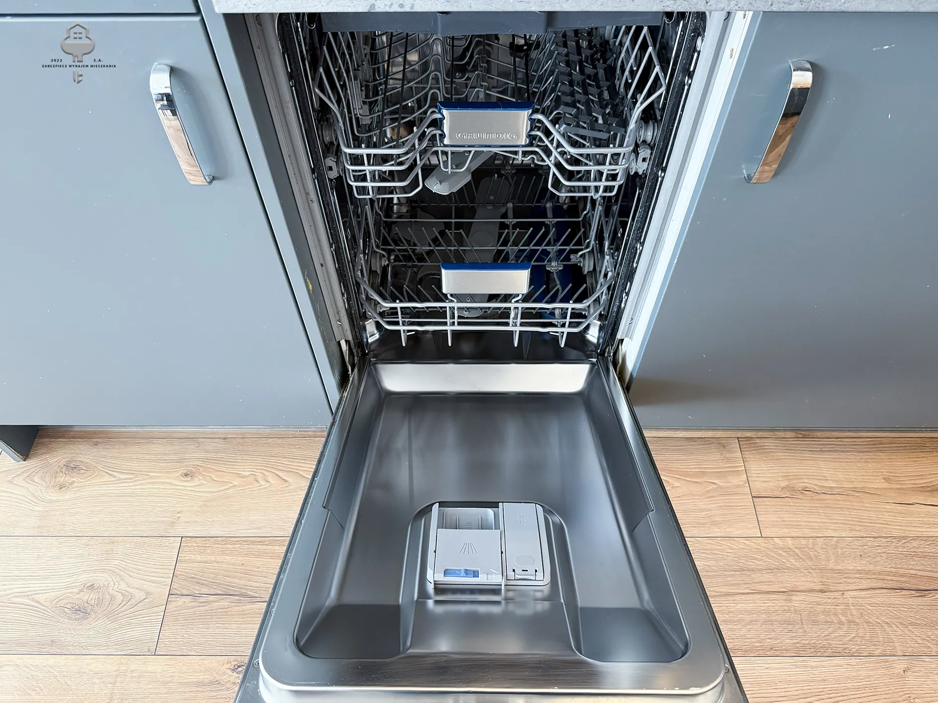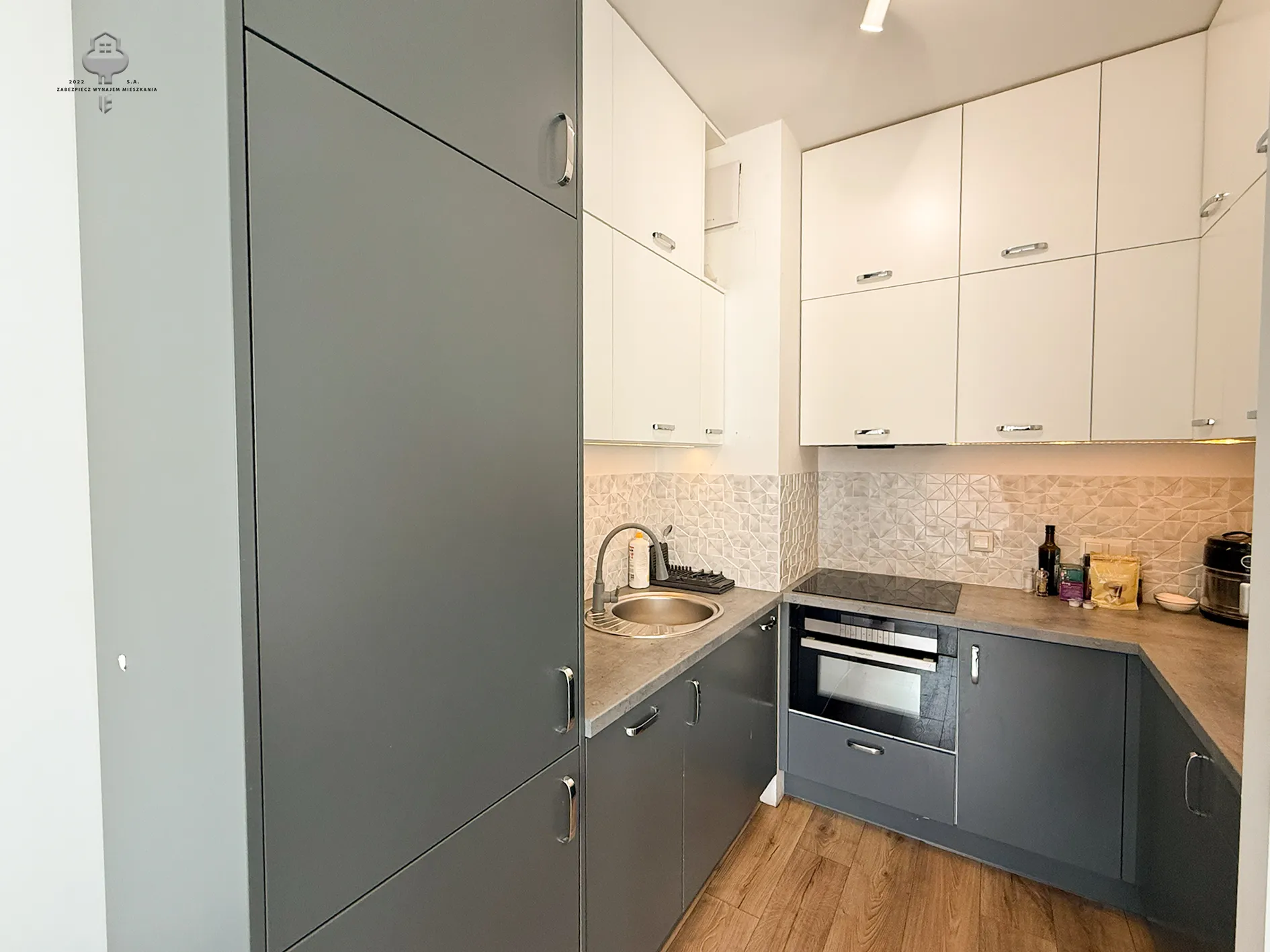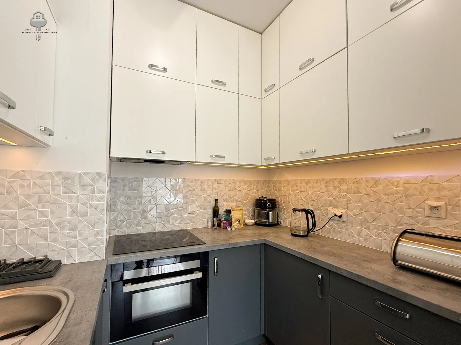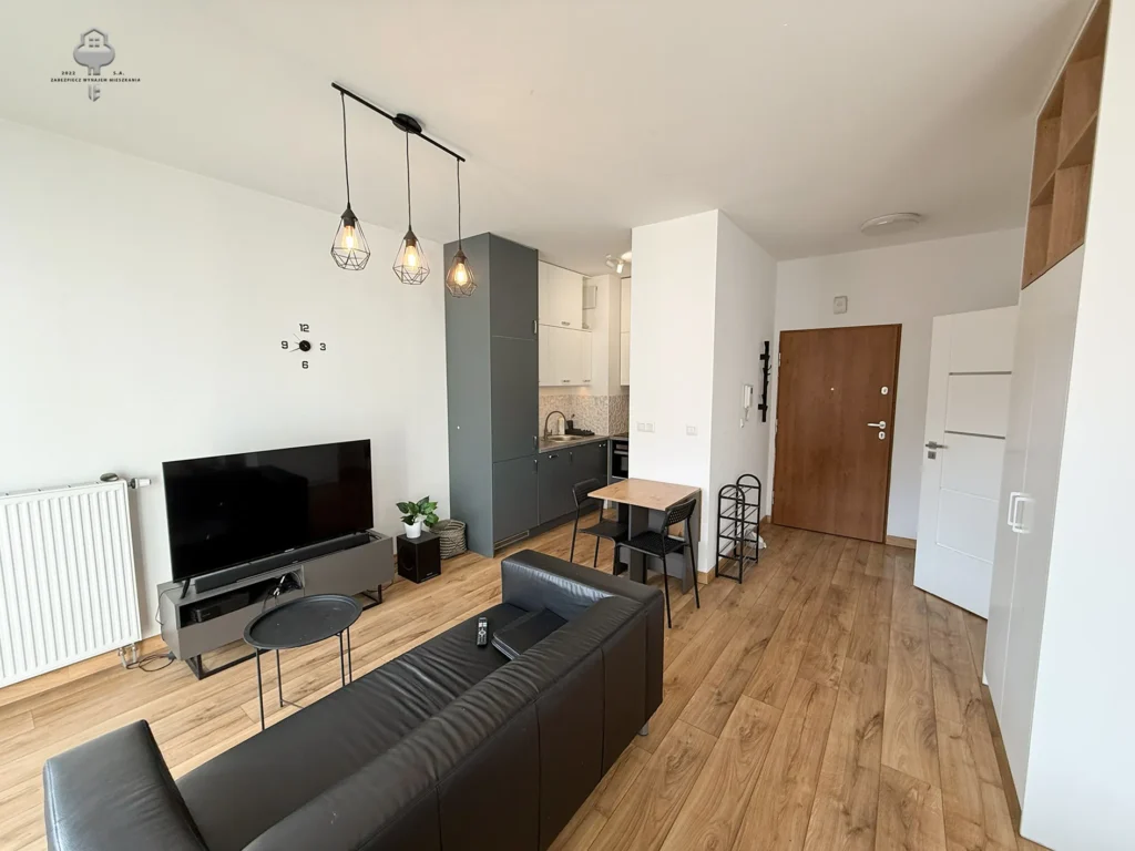 – Otwarta kuchnia: pełna zabudowa mebli kuchennych, zmywarka, piekarnik, płyta indukcyjna, zlewozmywak, chlebak, czajnik.