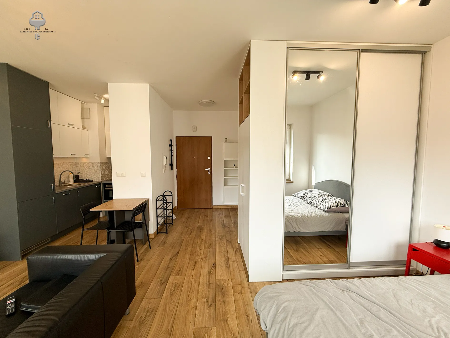 -Pokój z wydzieloną strefą sypialnianą: sofa, stolik kawowy, stół i dwa krzesła, stolik pod TV wraz z TV, duża, podwójna szafa, duże łóżko, stolik nocny, lampka.