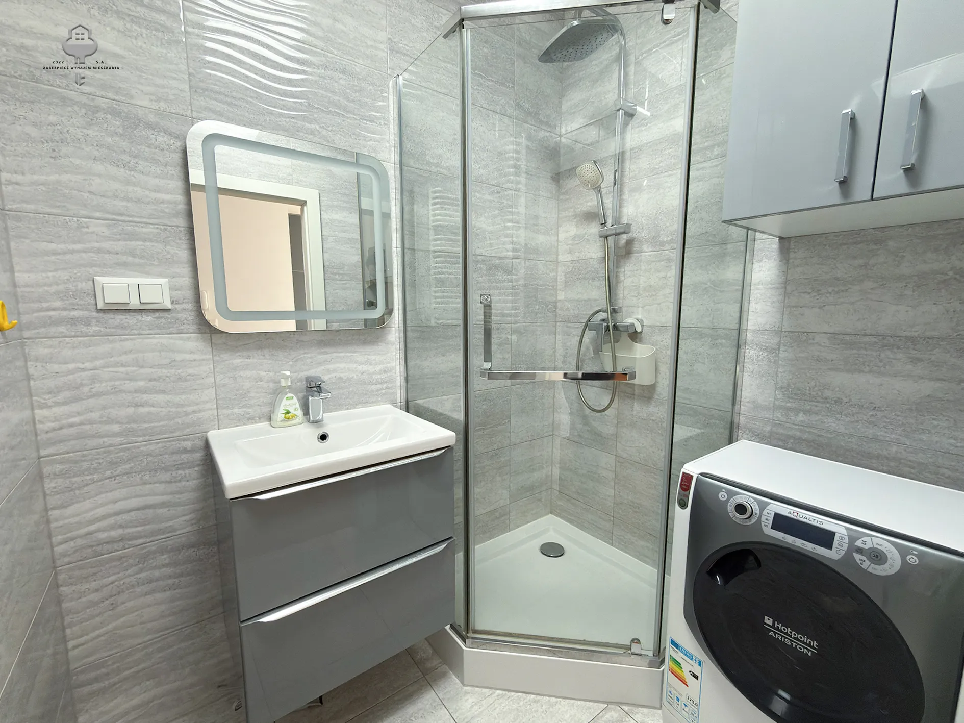 -Łazienka: meble łazienkowe, pralka, sedes, umywalka, prysznic.