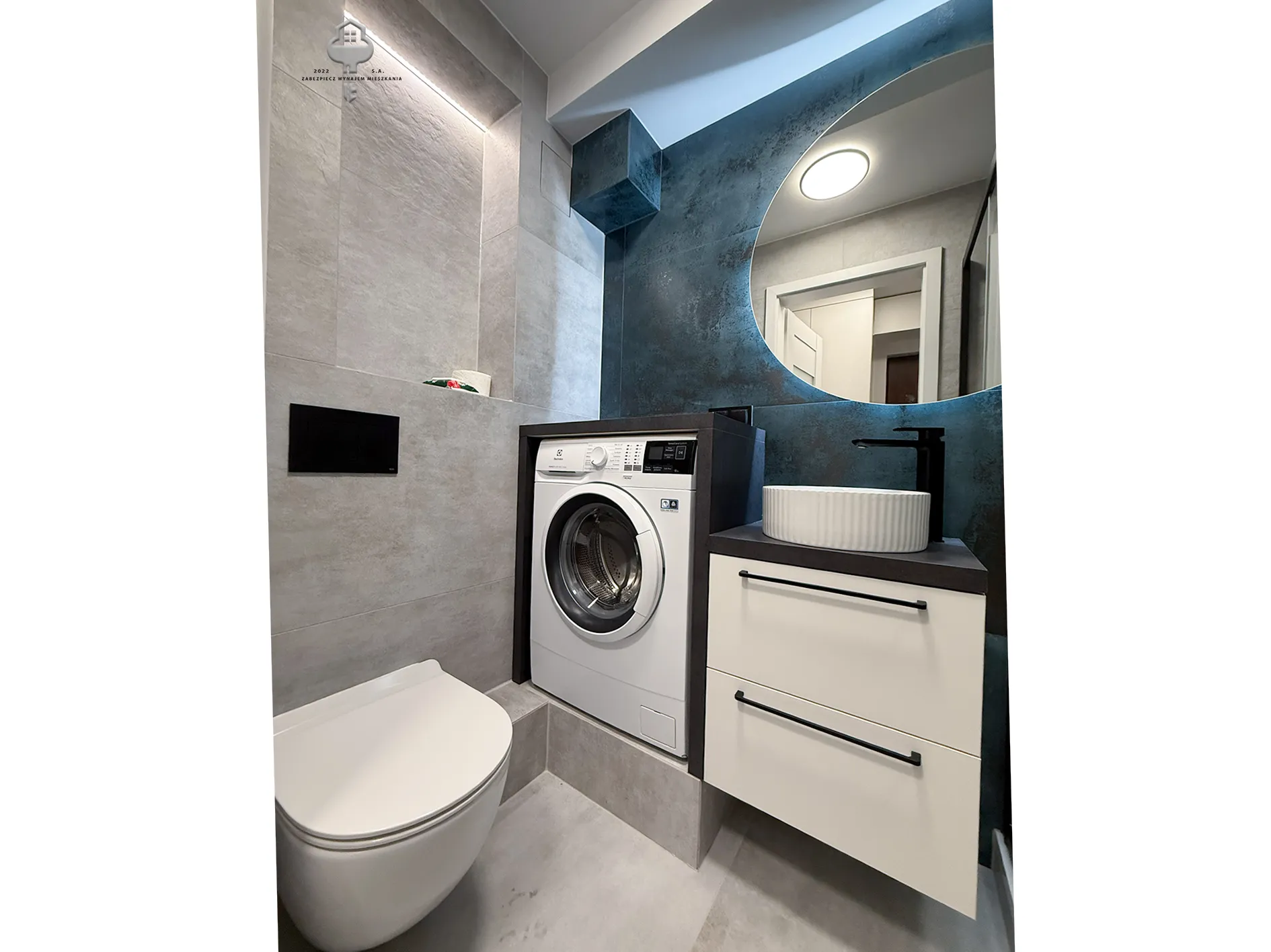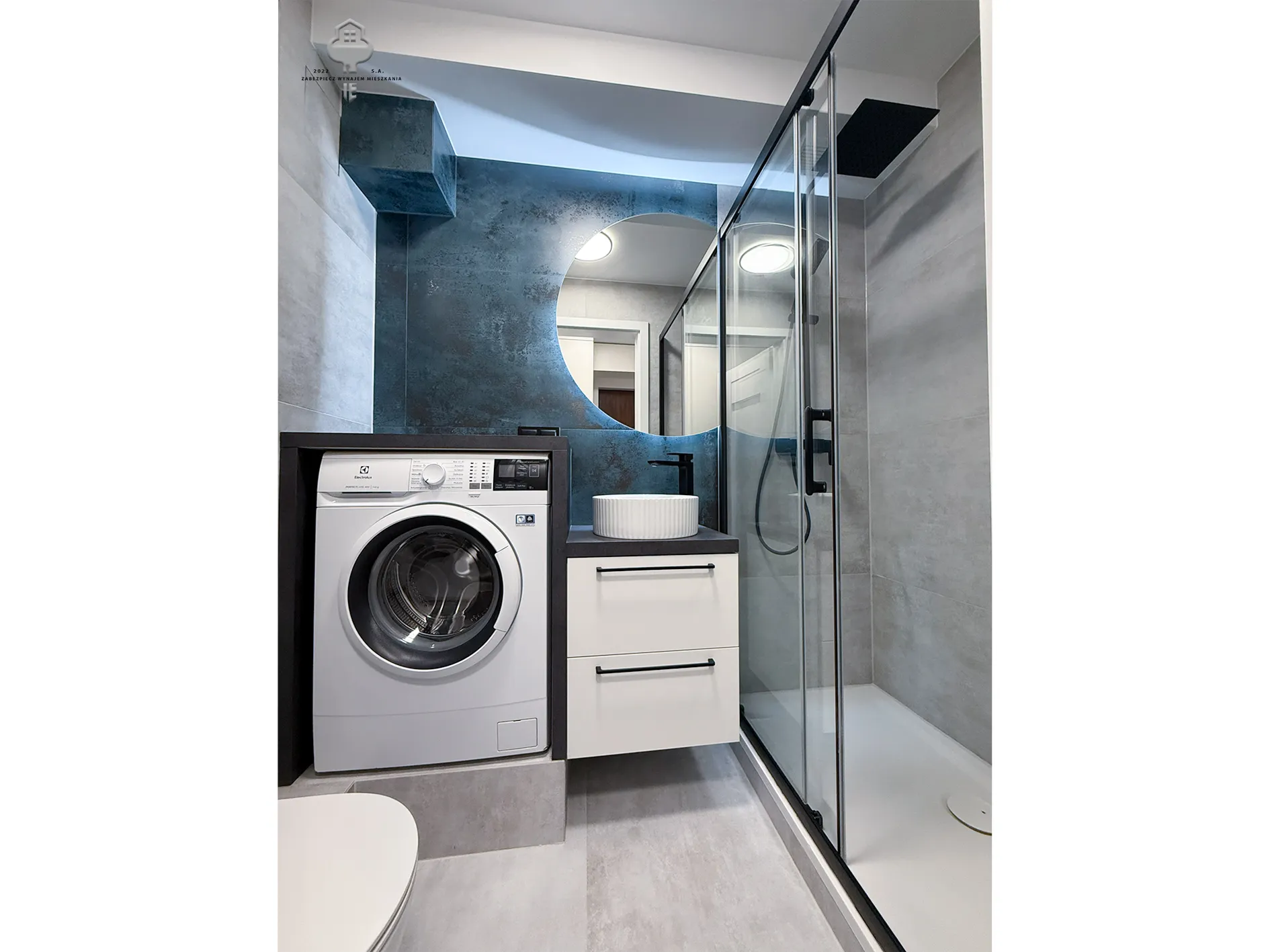 3) Łazienka: Geberit w zabudowie, pralka, umywalka z szafką, lustro, prysznic;