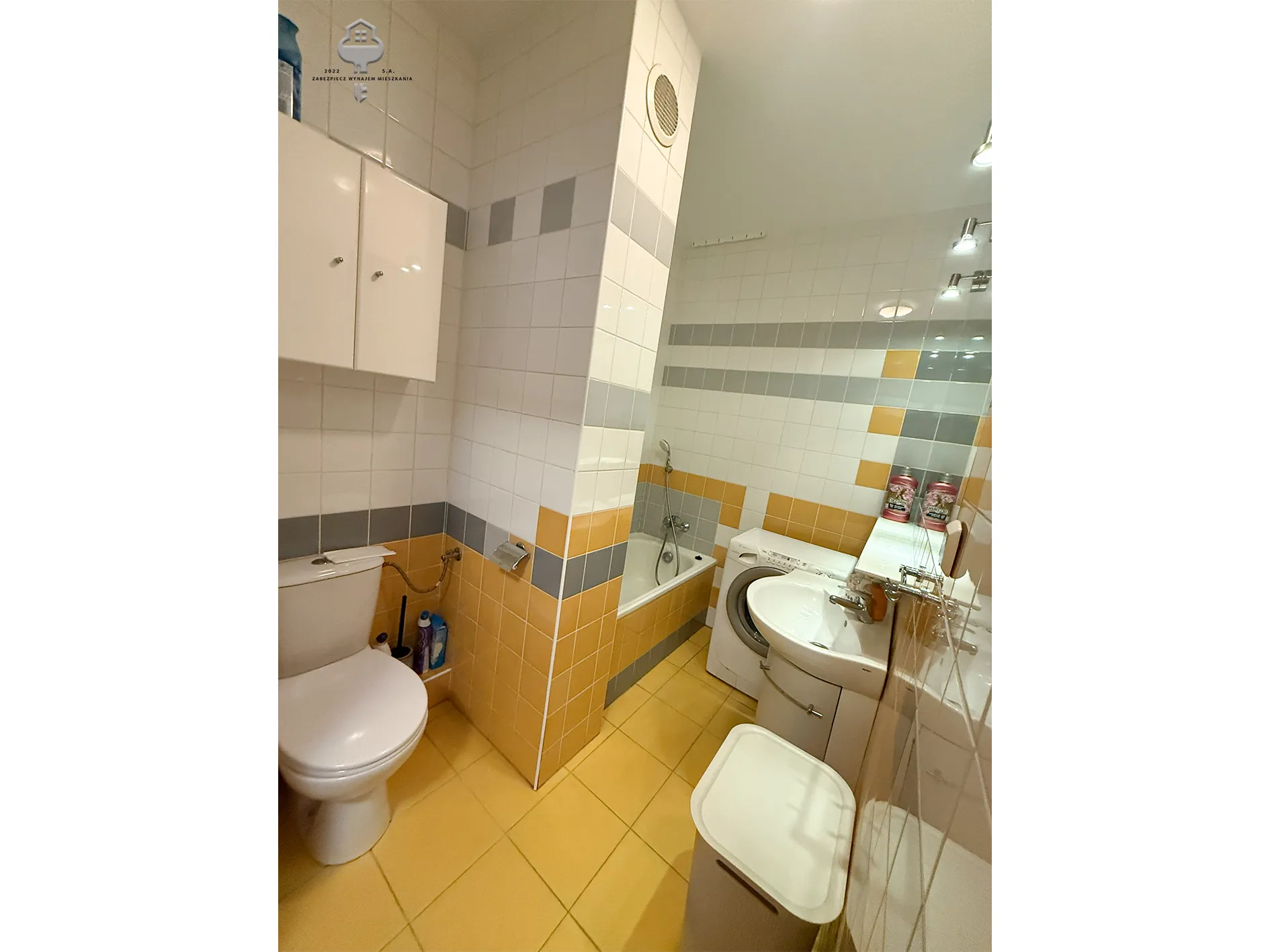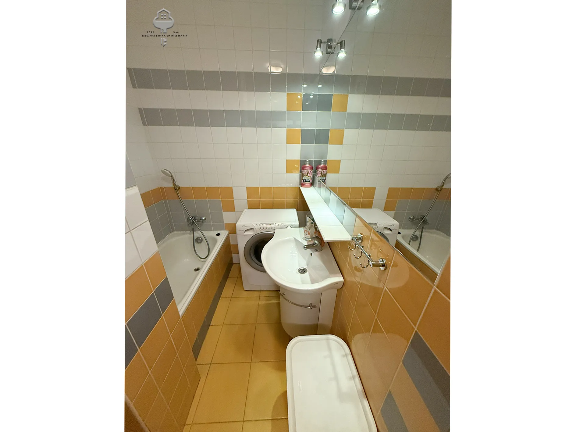 4) Łazienka: pralka, wanna, kompakt WC, szafka, umywalka z szafką, lustro, szafka,