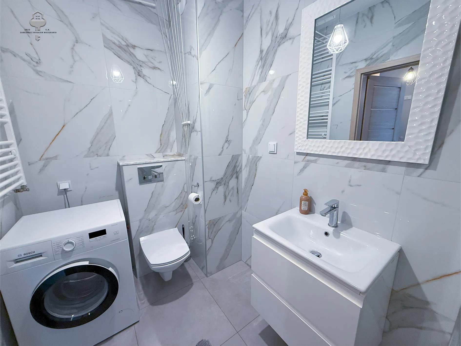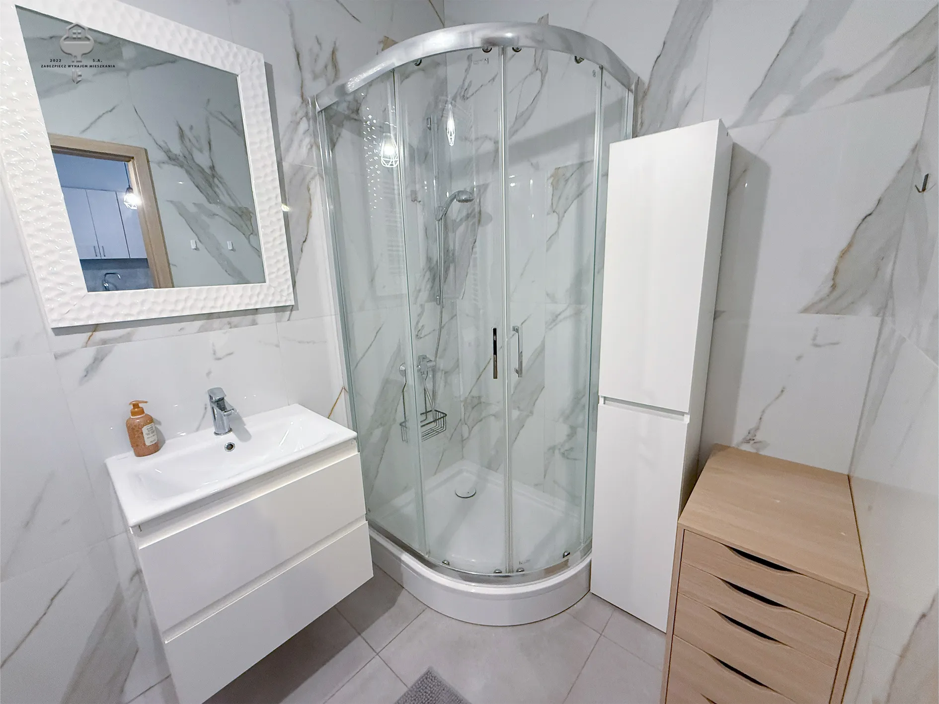 4) Łazienka: prysznic, wisząca szafka z umywalką, lustro, szafka, szafka z szufladami, geberit w zabudowie, pralka;