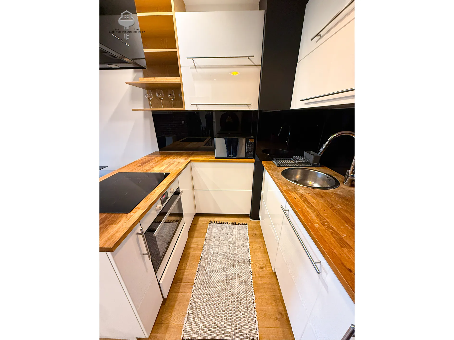 1) Aneks kuchenny: zabudowa meblowa kuchenna, lodówka, płyta indukcyjna, mikrofala, czajnik elektryczny, piekarnik, zmywarka;