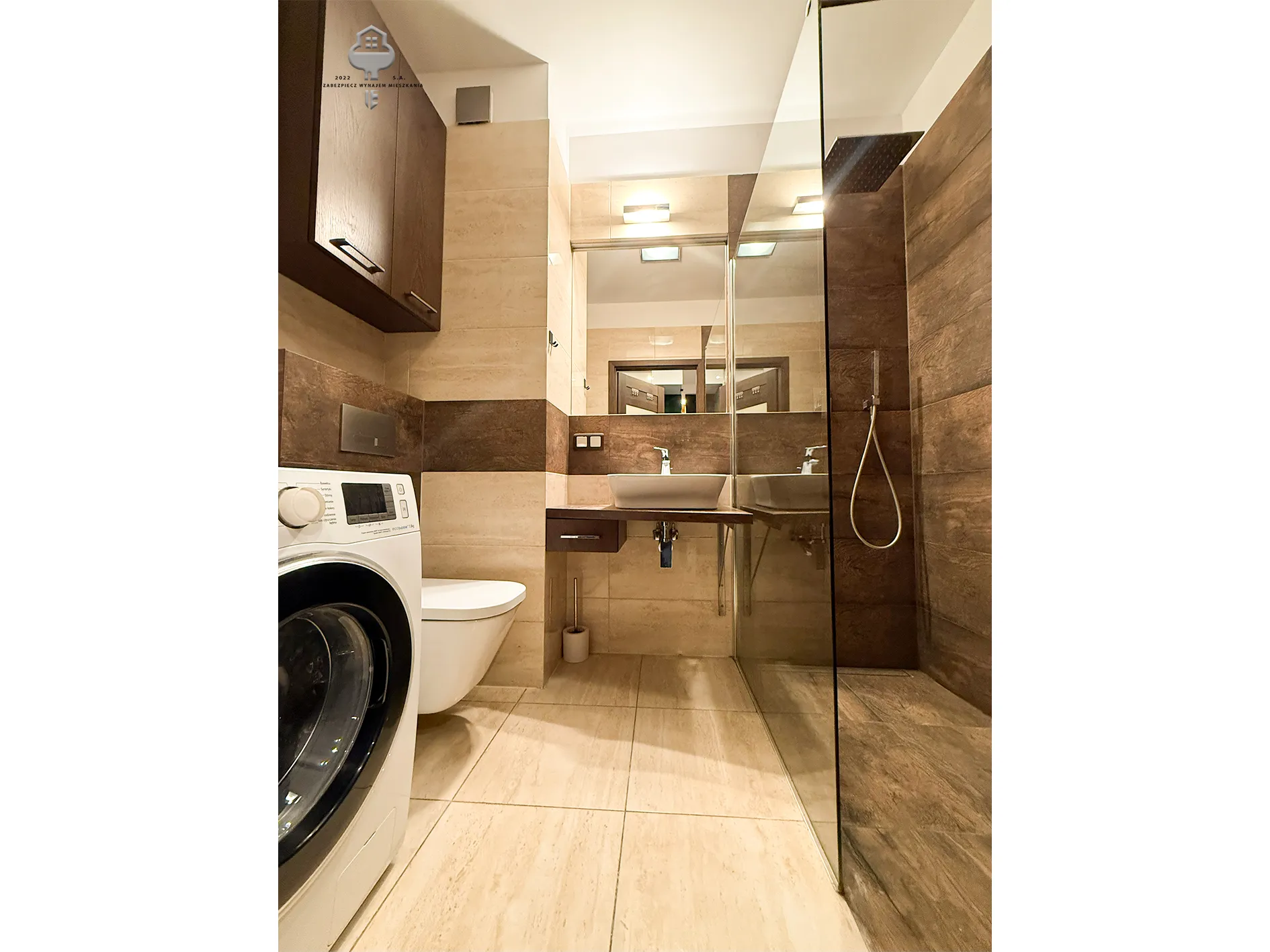 4) Łazienka: prysznic, Geberit w zabudowie, pralka, umywalka, lustro, wisząca szafka;