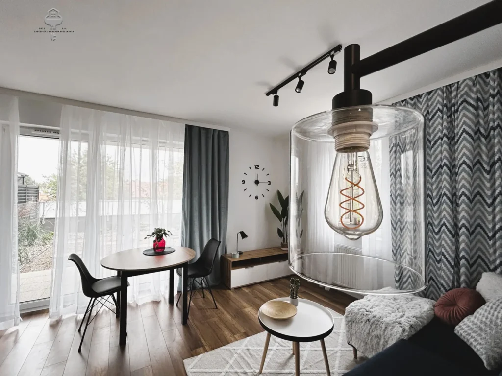 Nieruchomość zlokalizowana w pobliżu lasu na zamkniętym osiedlu. Lokal składa się z aneksu kuchennego z salonem, który ma dostęp do tarasu i ogródka, sypialni, łazienki i przedpokoju. Mieszkania zaaranżowane w wysokim standardzie o dominującej jasnej tonacji z dodatkiem drewna i ciemnych elementów.