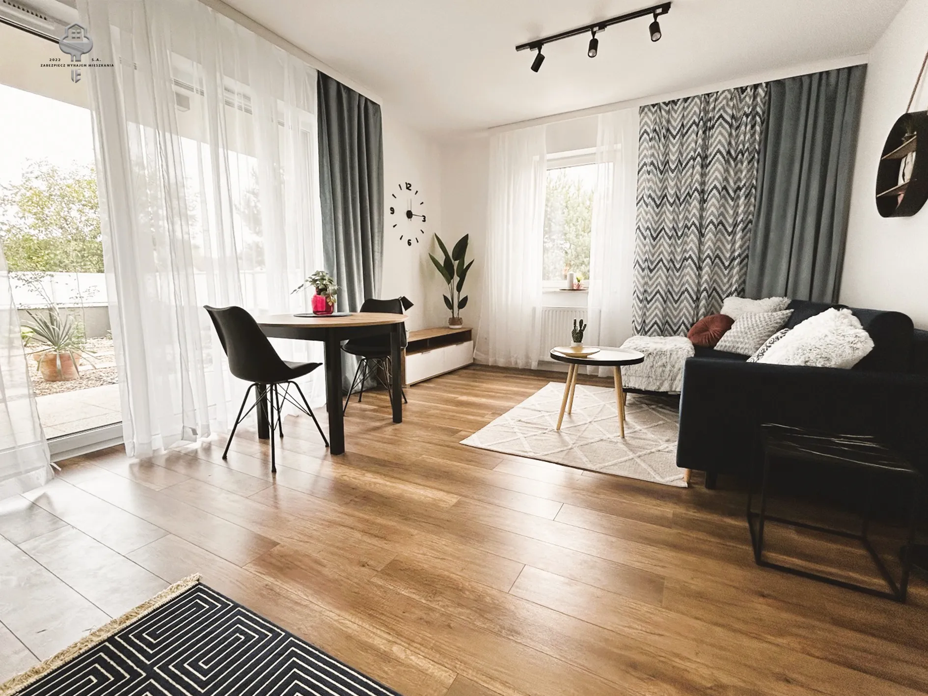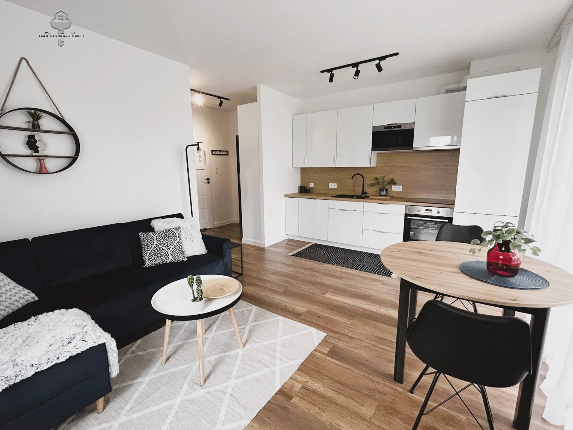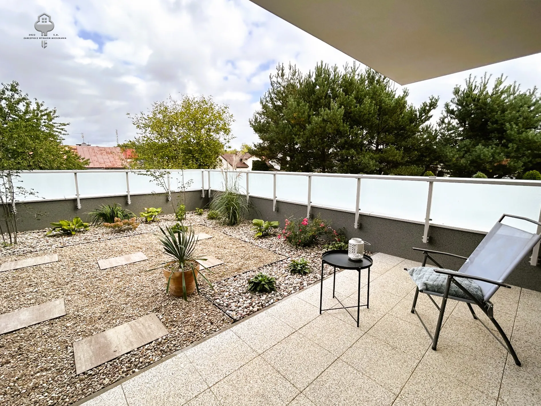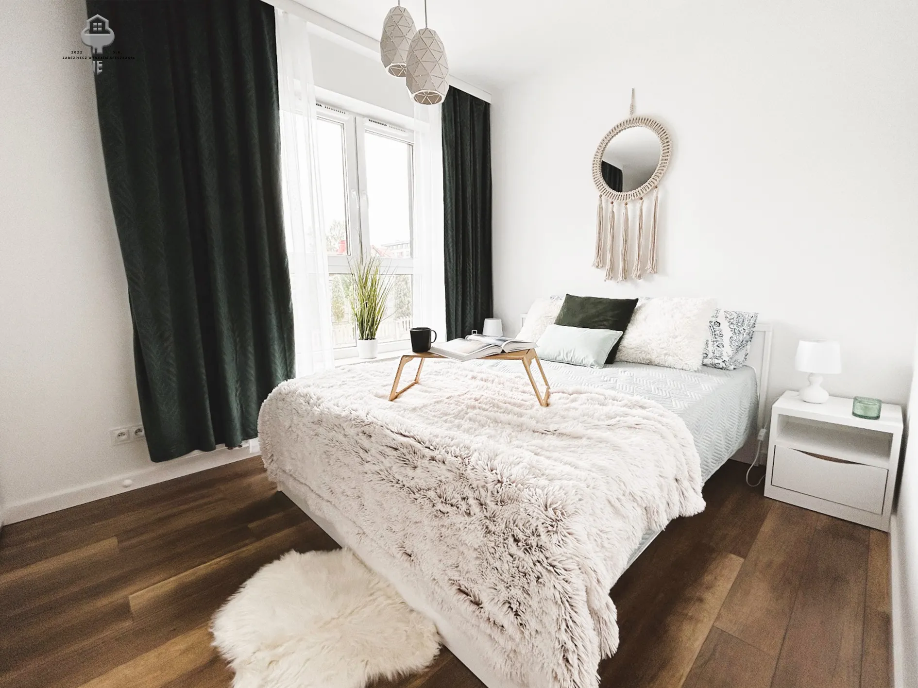 Nieruchomość zlokalizowana w pobliżu lasu na zamkniętym osiedlu. Lokal składa się z aneksu kuchennego z salonem, który ma dostęp do tarasu i ogródka, sypialni, łazienki i przedpokoju. Mieszkania zaaranżowane w wysokim standardzie o dominującej jasnej tonacji z dodatkiem drewna i ciemnych elementów.