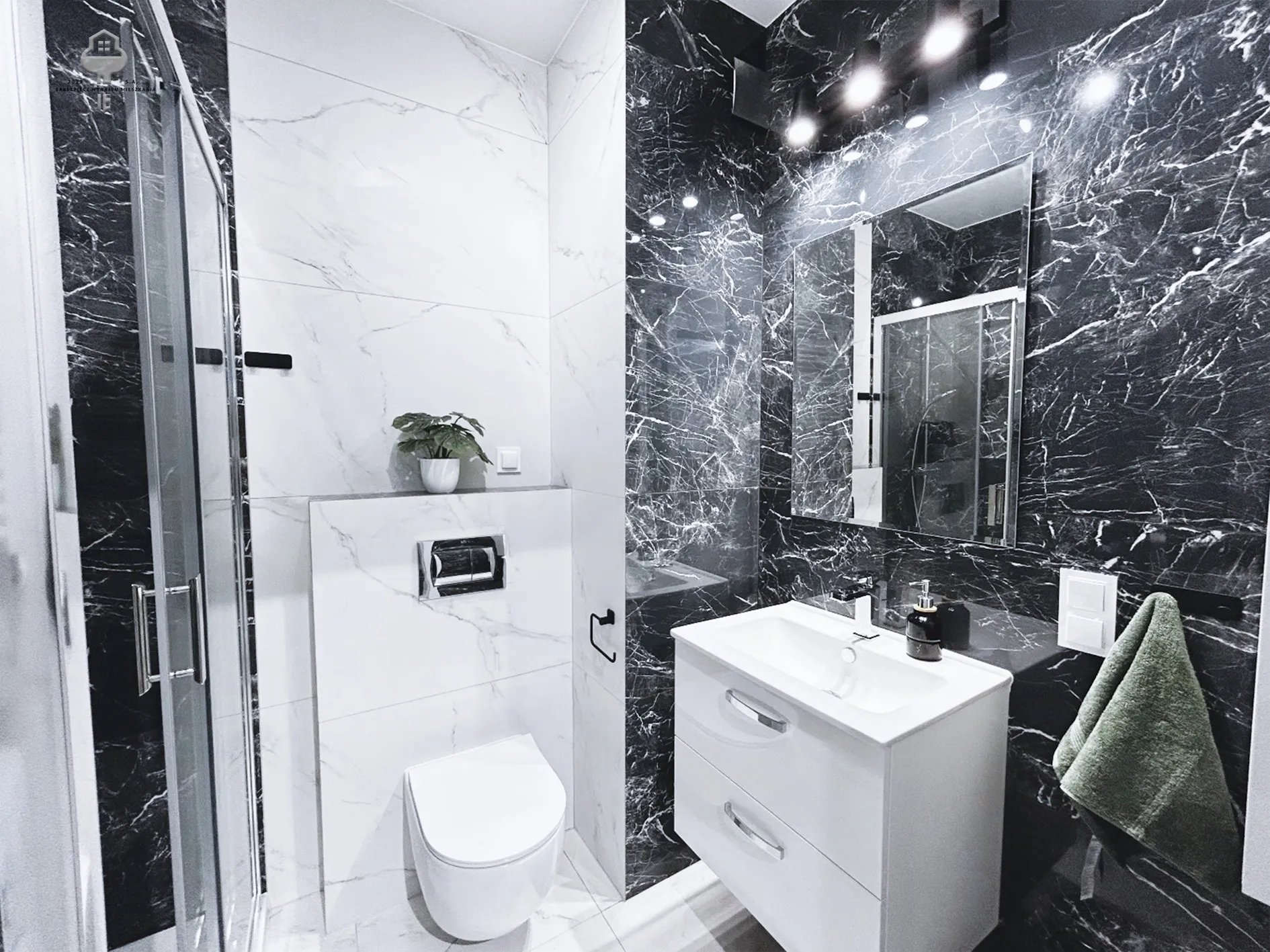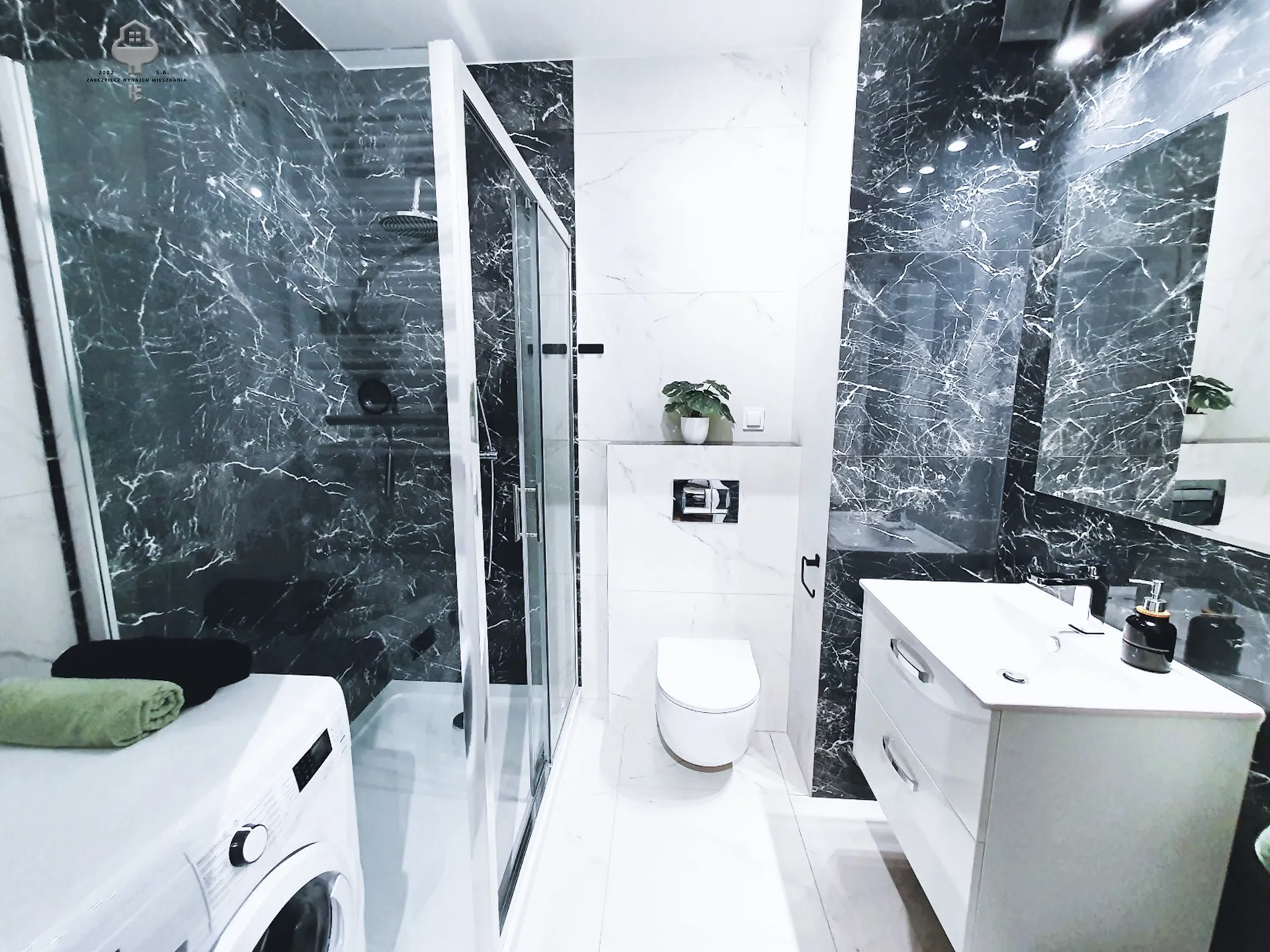 4) Łazienka: pralka, przysznic z deszczownicą, termostatem i brodzikiem, wc, umywalka z szafką, lustro, szafka łazienkowa
