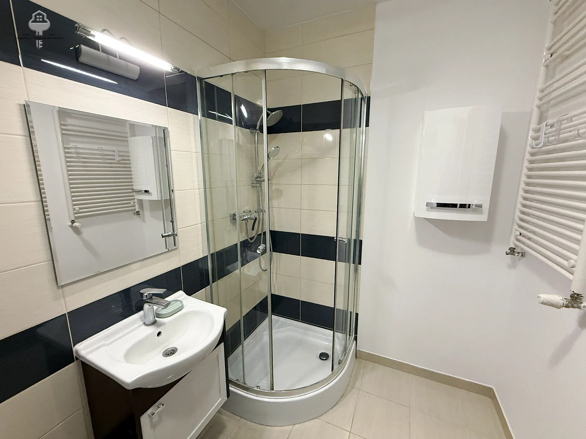 4) Łazienka: prysznic, szafka z umywalką, lustro, kompakt WC, pralka, piec gazowy, słupek;