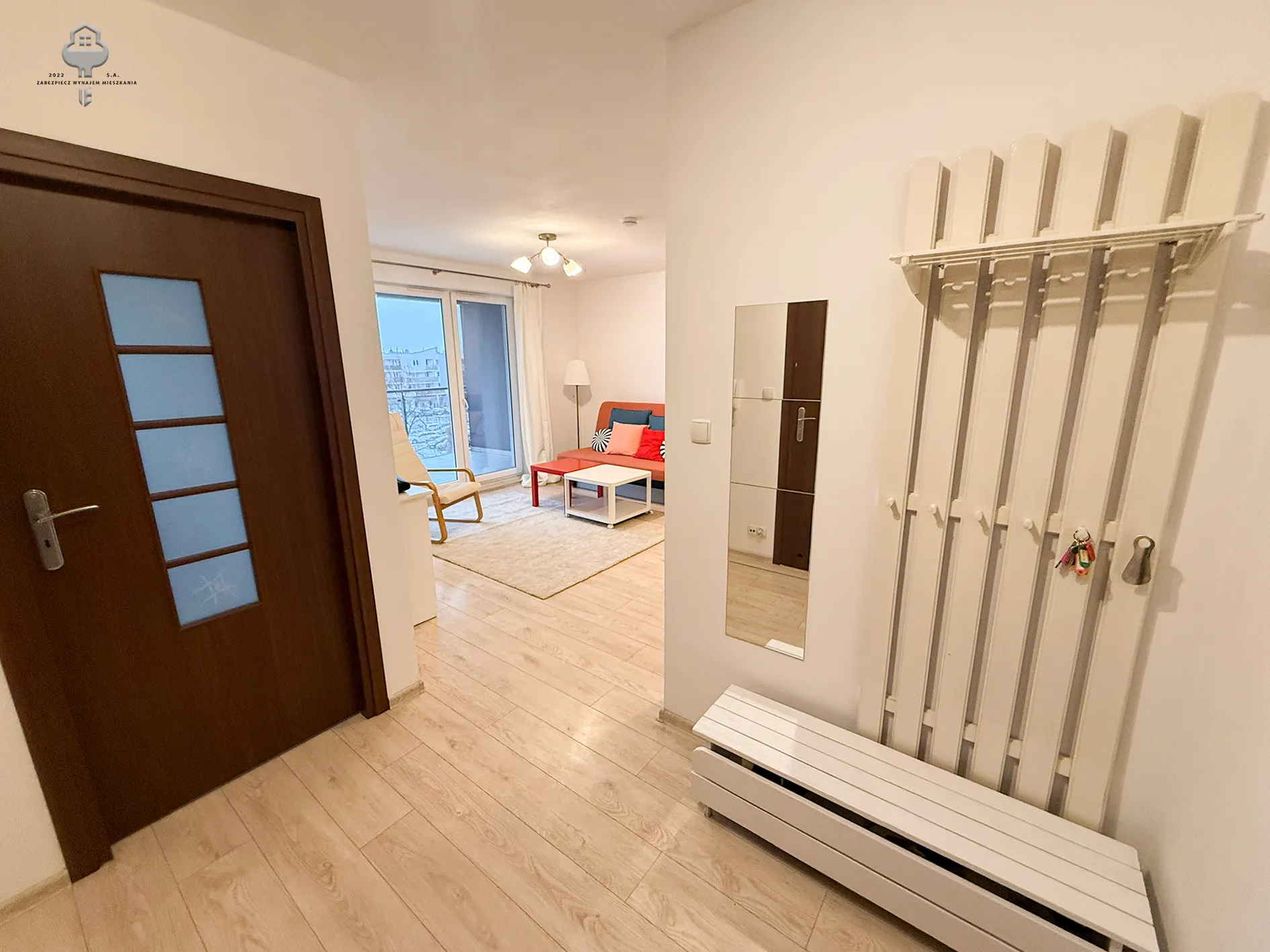 5) Przedpokój: wieszaki z ławą, domofon, lustro, ;