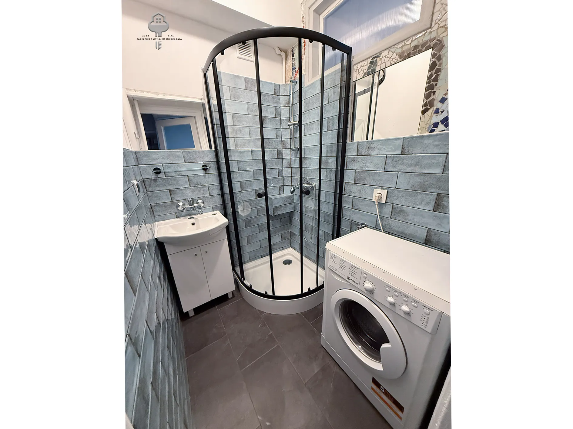 4) Łazienka: prysznic, umywalka z szafką, lustro, pralka;