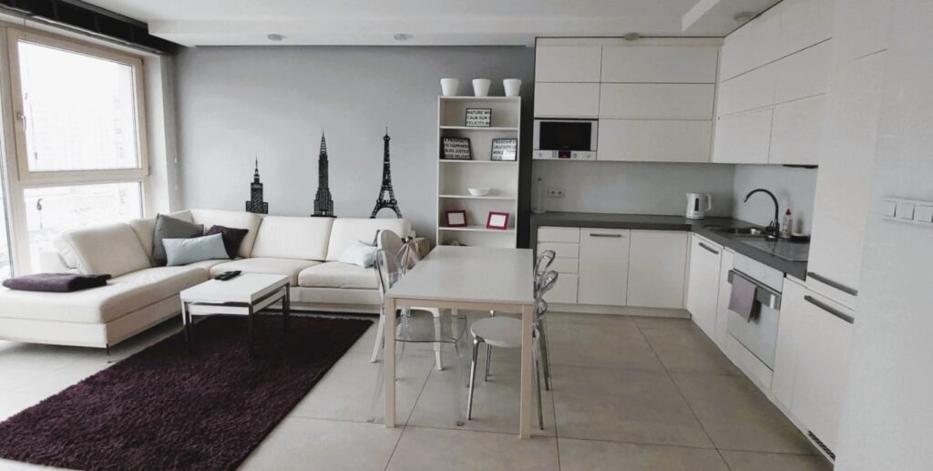 1) pokój dzienny z aneksem kuchennym: zabudowa meblowa, lodówko-zamrażarka, piekarnik, płyta indukcyjna, okap, zmywarka, kuchenka mikrofalowa, czajnik elektryczny, mikser, zastawa stołowa, kanapa narożna, stół z 4 krzesłami, szafka RTV wraz z telewizorem i odtwarzaczem DVD, stolik kawowy, regał;