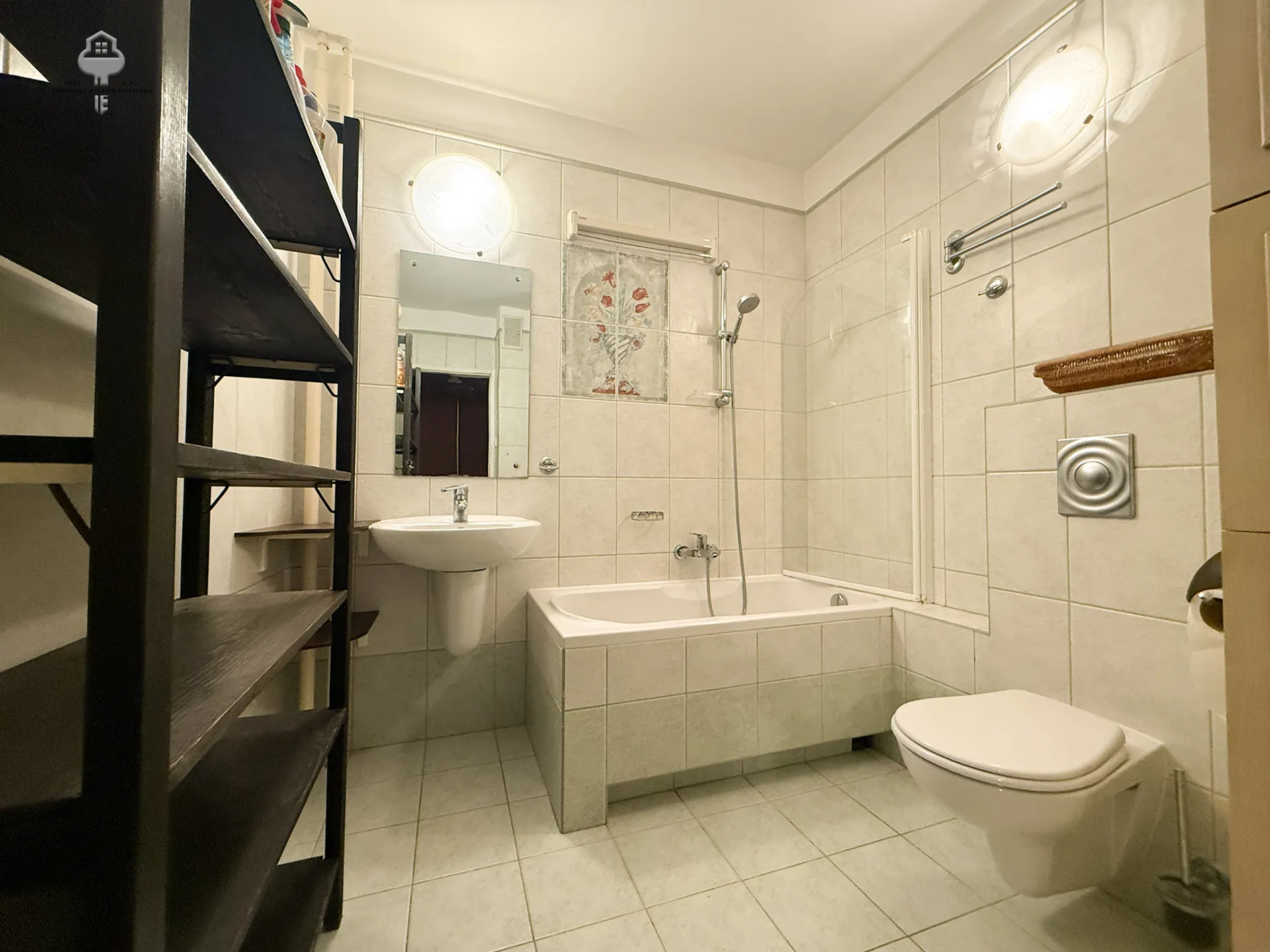 5) Łazienka: wanna, szafka, geberit w zabudowie, stojąca szafka z półkami, lustro, umywalka