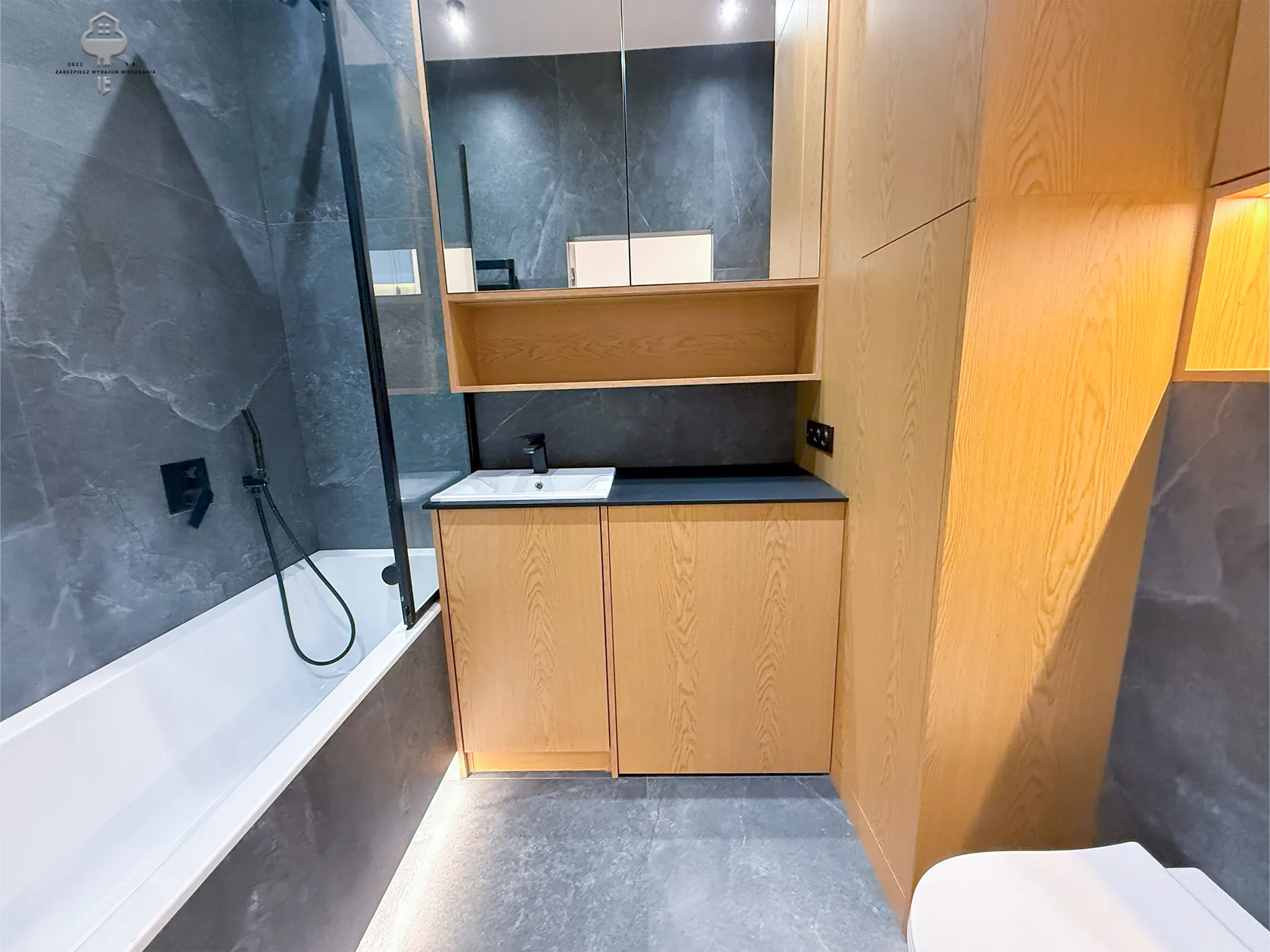 4) Łazienka: zabudowa łazienkowa z umywalką i lustrem, wanna, geberit w zabudowie;