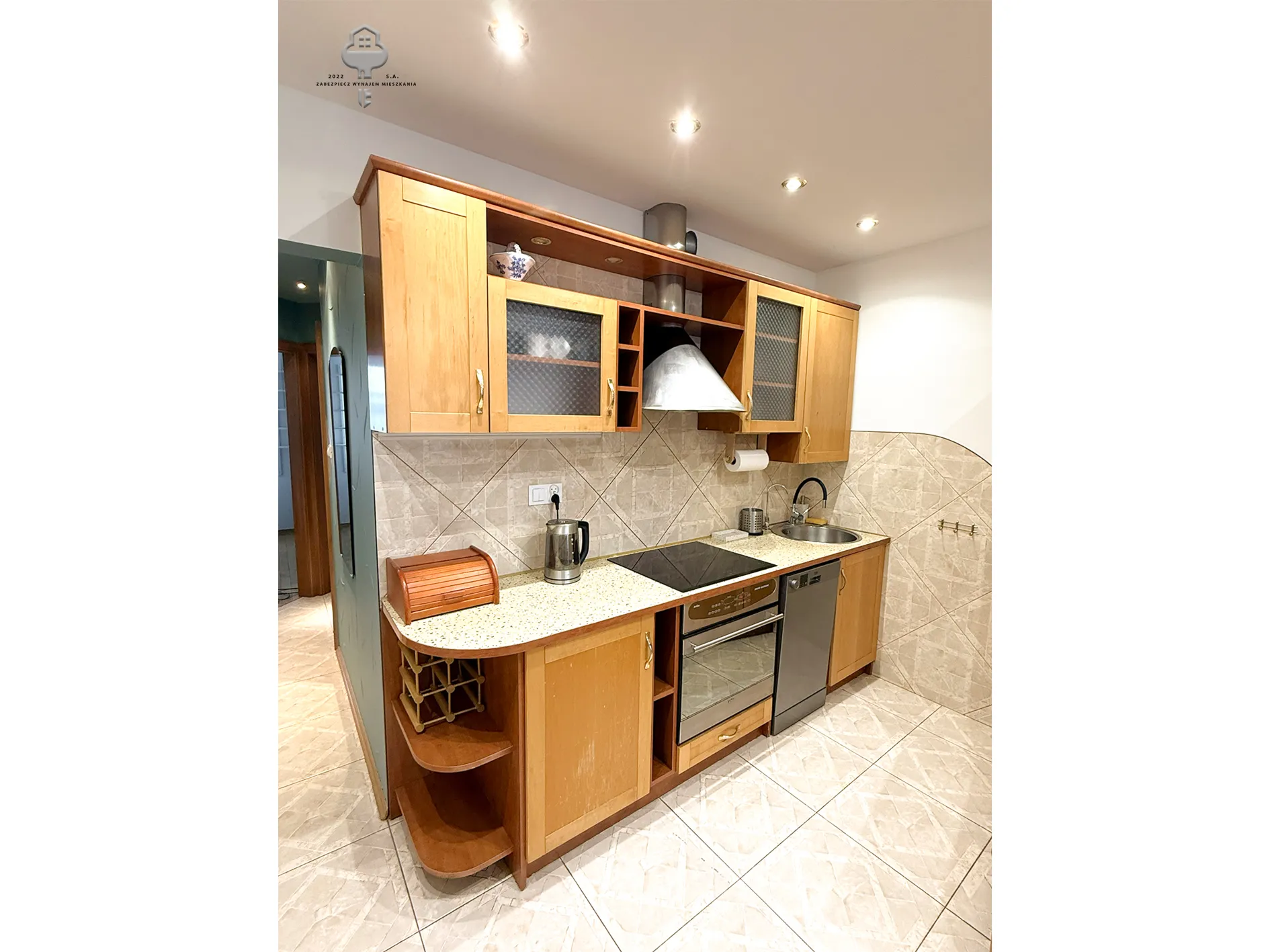 – Aneks kuchenny: zabudowa kuchenna, rozkładany stół, trzy krzesła, zmywarka, lodówka, płyta indukcyjna, piekarnik, okap, mikrofalówka, czajnik, filtr odwróconej osmozy.