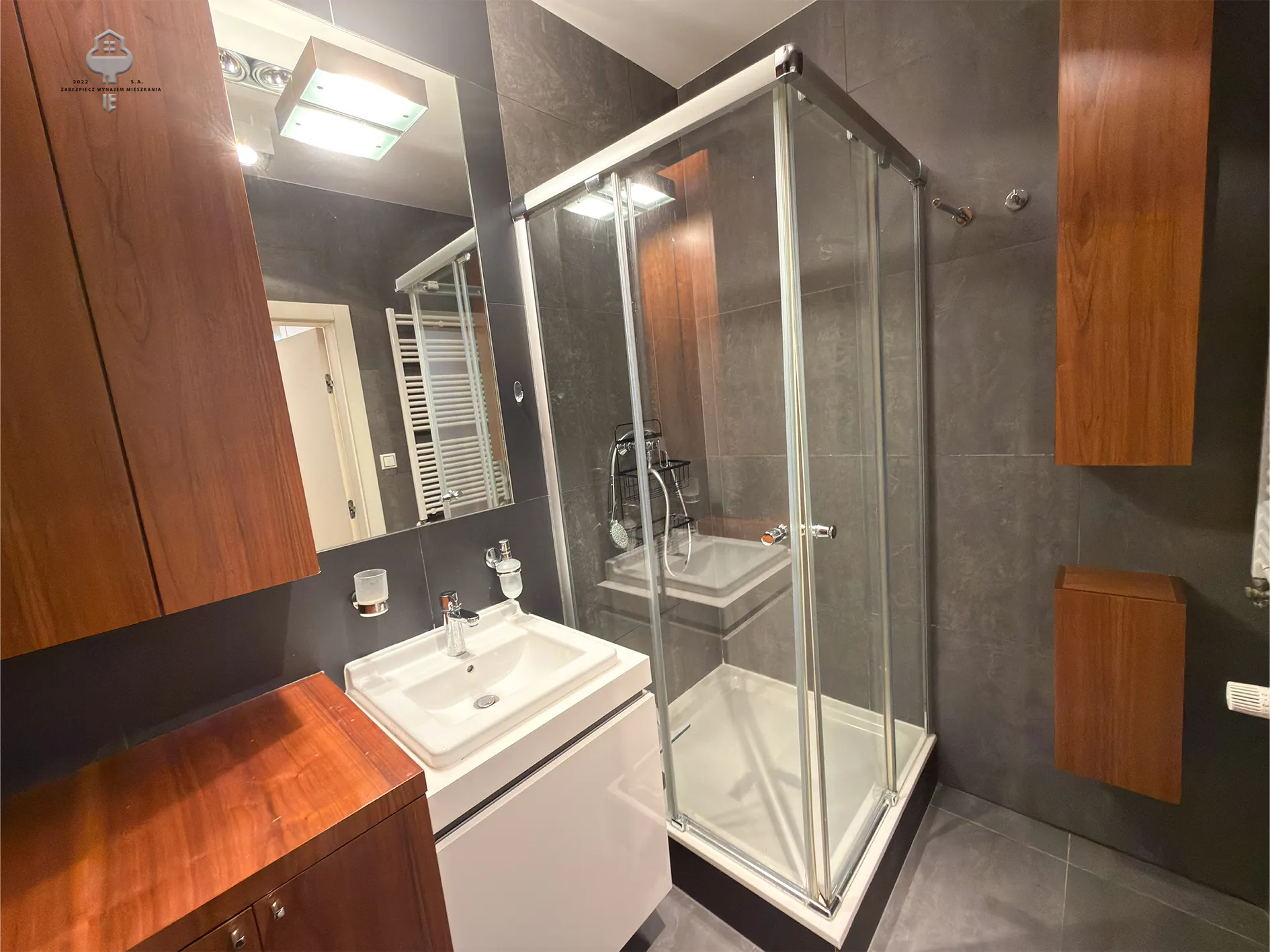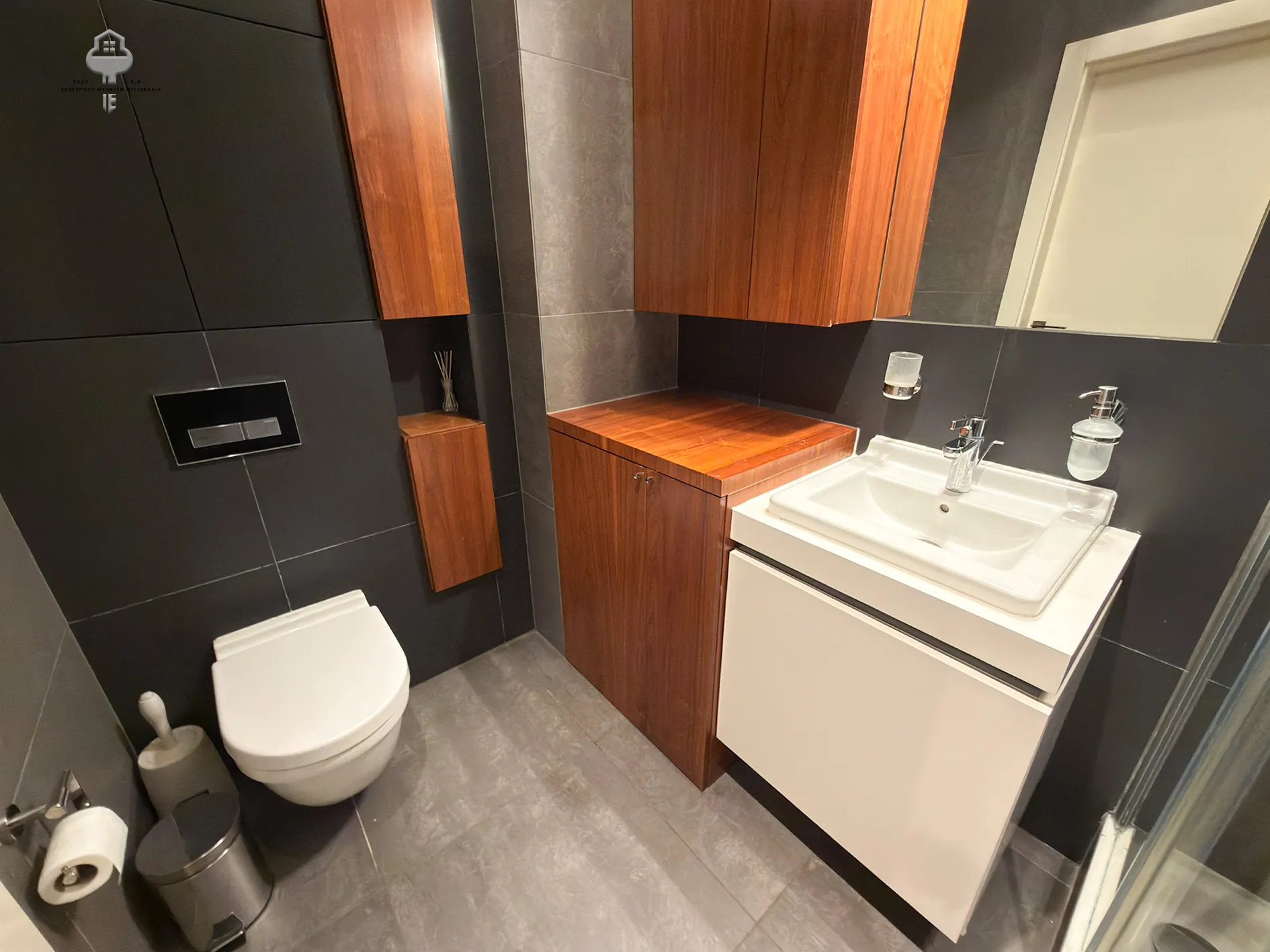 3) Łazienka: prysznic, Geberit w zabudowie, szafki, umywalka z szafką, lustro;