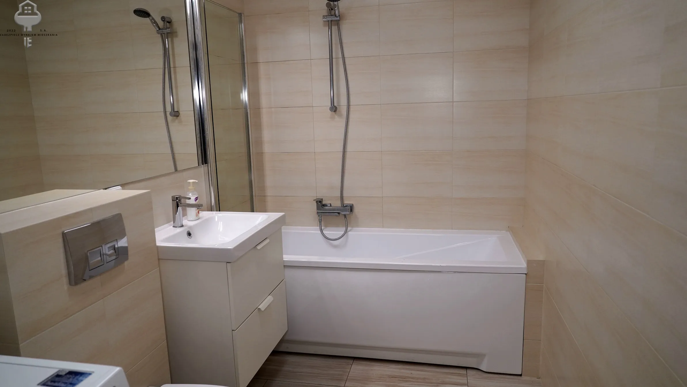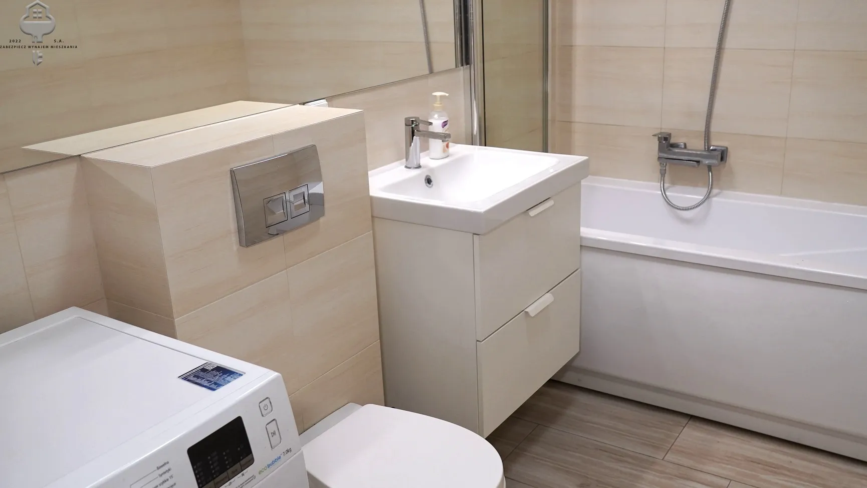 3) Łazienka: wanna z funkcją prysznica, Geberit z zabudowie, umywalka z szafką wiszącą oraz lustrem, pralka