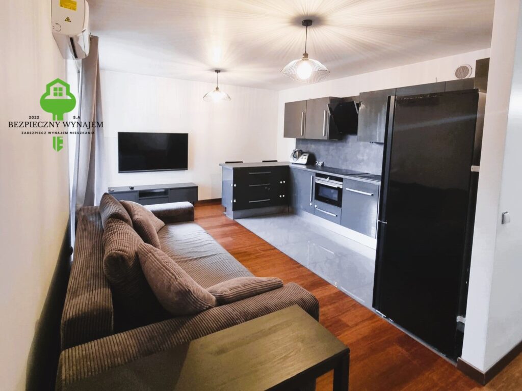 1) Pokój dzienny z aneksem kuchennym: zabudowa meblowa, lodówko-zamrażarka, płyta indukcyjna, piekarnik, okap, zmywarka, czajnik, robot kuchenny, 2 krzesła, kanapa, telewizor, szafka RTV, klimatyzator ścienny, stolik;